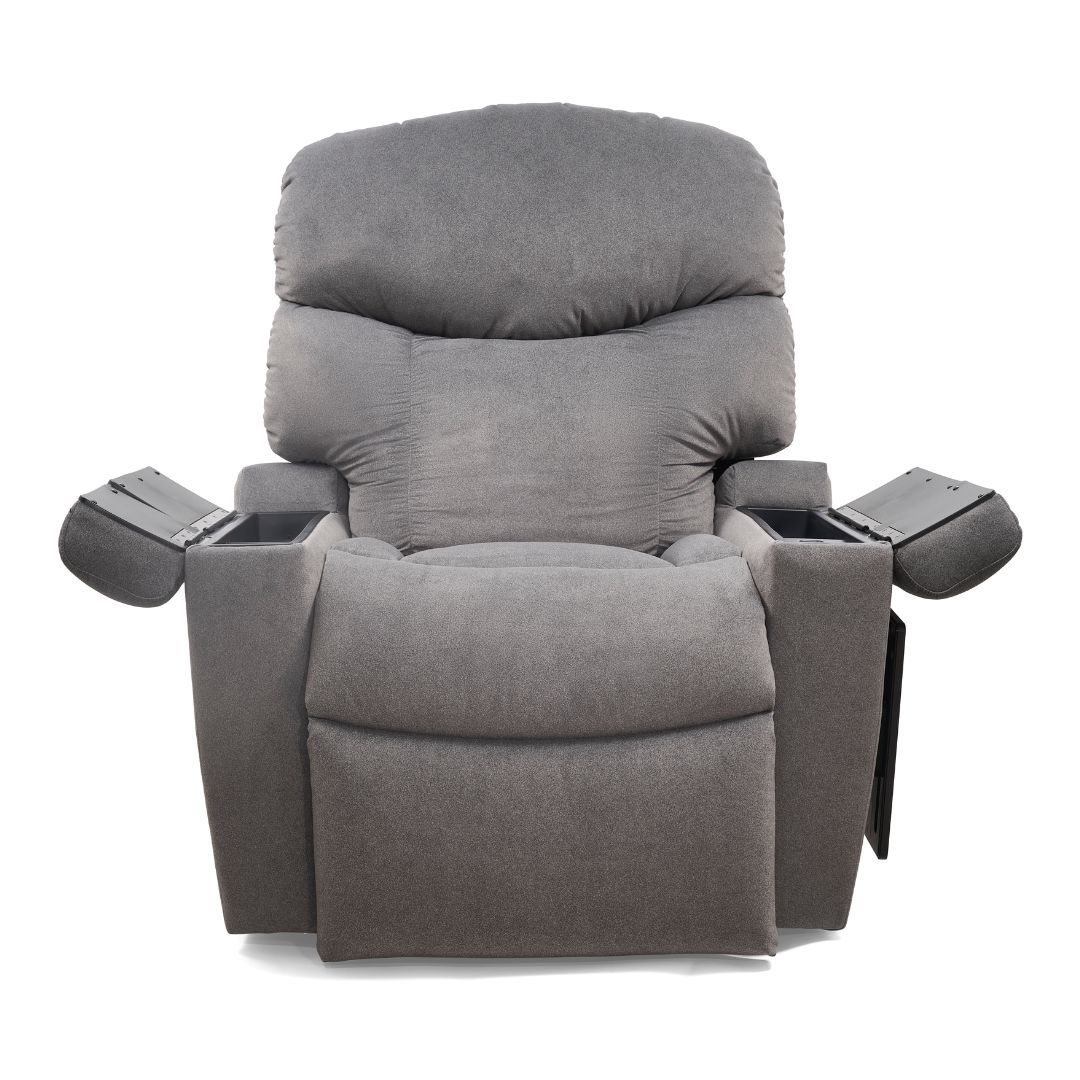 - Open-arm design with hidden storage – keep essentials close with built-in compartments