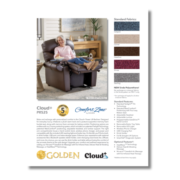 The Cloud+ Power Lift Recliner by Golden takes relaxation to the next level—combining comfort, technology, and thoughtful design in one customer favorite. With its plush seamed back, posture-friendly bucket seat, and patented Twilight Tilt Technology, it’s built for total body wellness. The 5-Zone Comfort Zone system lets you independently adjust the footrest, backrest, headrest, lumbar, and tilt, so you can always find your perfect position.
