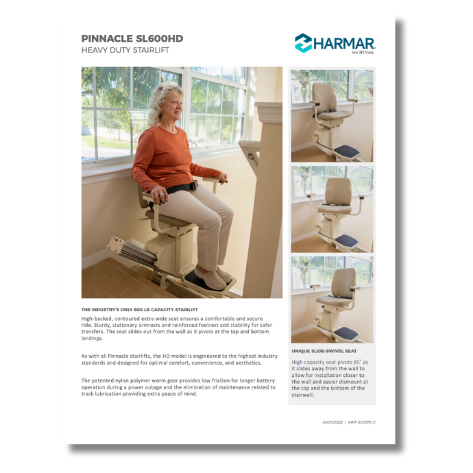 The SL600HD Pinnacle stands out because it delivers unmatched strength without sacrificing comfort or reliability. We love how thoughtfully it’s designed for users who need extra support, from the plush, wide seating to the reinforced components that provide confidence at every step. Its smooth ride, quiet performance, and low-maintenance design make it a dependable solution for long-term mobility, whether in a private residence or a commercial setting. This stairlift proves that heavy-duty can still mean comfortable, discreet, and easy to use.