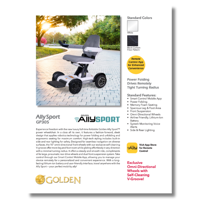 The Ally Sport by Golden Technologies is the perfect blend of luxury, technology, and portability—making it a standout option for those who want more from their power wheelchair. Whether you're running errands or heading out on vacation, the Ally Sport’s robotics-driven power folding and Smart Control Mobile App make life easier with the touch of a button. Its memory foam seat and spacious leg area provide premium comfort, while advanced omni-directional wheels and front suspension ensure a smooth ride wherever you go.
